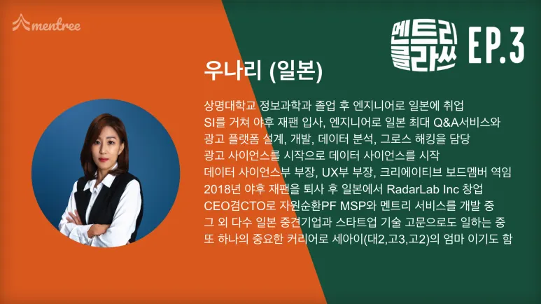 모더레이터로는 세 아이를 키우며 일본에서 커리어를 이어가고 있는 ‘멘트리’의 우나리 대표님이 함께해 주셨습니다.